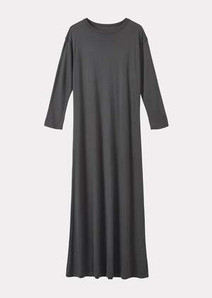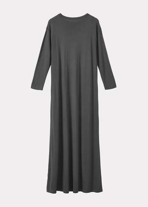 This timeless, long sleeve dress in charcoal with a high neckline recalls a 90s simplicity. Crafted from jersey cotton and cut to loosely hug the figure, this flattering style can be dressed up or down with trainers or barely there sandals.
