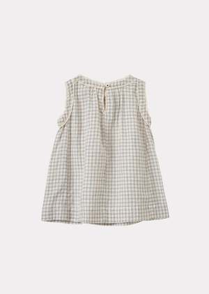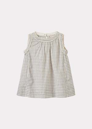 Celebrated for its elegance and breathable feel: Our Ginger Baby Dress in a white and navy check print. Featuring rickrack detailing around the armholes and at the gathered neckline, this sleeveless style will keep your little one cool during the summer months. 100% Handloomed Cotton.