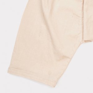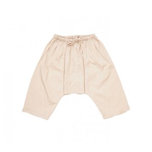 From Caramel. Lightweight cotton poplin baby trouser with square cut gusset and dropped crotch. - From Caramel London Spring/Summer 2018 - 100% cotton in Light Sand - Unisex baby pant - Elasticized drawstring waistband - Harem silhouette - Coordinating zigzag stitching along gusset seams - Relaxed fit