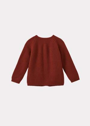 In a warm cinnamon red tone, the Rosa Baby Cardigan is crafted from soft cashmere for gentle, year-round comfort. It features a round neckline, raglan sleeves, and ribbed detailing at the cuffs, hem, and neckline, and is finished with tonal buttons and subtle CBC embroidery. Fabric: 100% cashmere.
