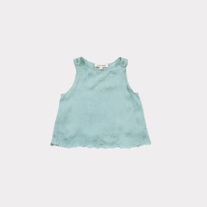 From Caramel. Simply cut with beautiful details, this delicate baby girl top features vintage inspired floral embroidery details at neckline and hem. - From Caramel London Spring/Summer 2018 - 100% viscose in Dusty Turquoise - Baby girl blouse - Sleeveless - Monotone scalloped trim at neckline, armholes and hem - Rounded neckline and hem - Single button fastening at both shoulders