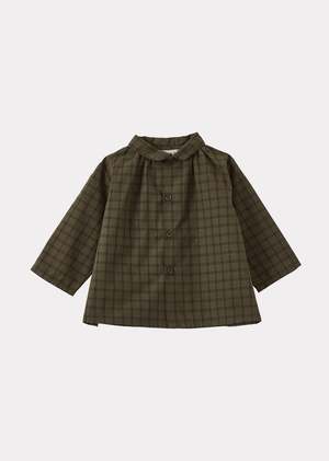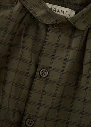 The Aloe Baby Shirt by Caramel features a khaki check pattern with green tones. Crafted from 100% cotton for softness and comfort against delicate skin.
