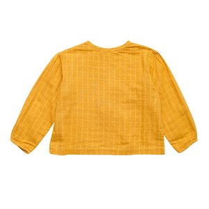 From Caramel Autumn / Winter 2018. Girl's blouse in a golden yellow muslin cotton with subtle tonal check print. Dropped shoulders and light tucks around the armhole seams add relaxed volume. - Girl's shirt - 100% cotton - Color: Golden - Long raglan sleeves - Dropped shoulders - Gathered at armholes and cuffs - Off-center two-button keyhole closure - Relaxed fit