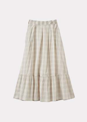 This maxi skirt features a flared shape with a voluminous frill at the bottom and a button opening at the side, offering a gentle nod to vintage summers. The pure cotton fabric is hand-woven by artisans on traditional looms and has a soft, lived-in feel. The Pleated Frill Skirt pairs beautifully with the Frill Blouse in a matching fabric. Its the piece youll reach for all summer long.