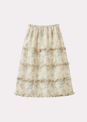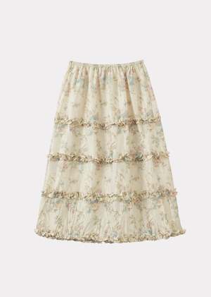 A modern twist on a timeless classic, the Verity midi skirt is crafted in painterly silk. With a flattering midi length, laser-cut ruffle details at the hem, and an elasticated waist for a comfortable fit, its a versatile and functional piece. The print boasts a warm palette of tea-leaf browns on a creamy base, scattered with sugar-dusted blues, pinks, and plums. Care: 100% Silk.
