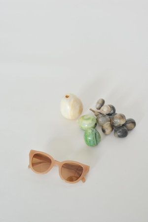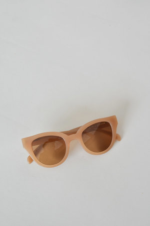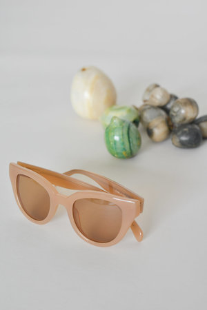 Subtle cat-eye with playful thick tan frame and soft colored lenses. - 48 mm lens, 18 mm bridge, 150 mm across - 100% UVA/UVB protection - unisex