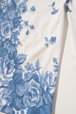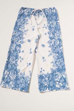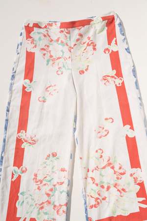 One-of-a-kind flat-front drawstring pant made from two vintage tablecloths. These pants feature one-of-a-kind textiles that were handpicked. This means they may include wear, distress, marks, and other signs of age intentionally, as this adds to the character of the finished garment. All one-of-a-kind items are final sale. Measurements (taken flat, back drawstring is adjustable): XL: waist: 18" / hip: 23" / inseam: 30" Vintage textiles; dry clean or hand wash. Made in Los Angeles; edition of 24. Type: OOAK.