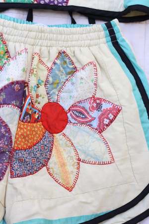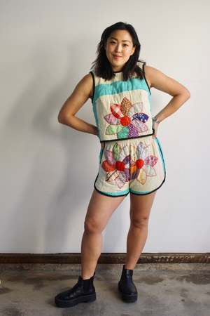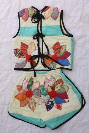 Super versatile sleeveless top made from vintage quilt textiles. Can be worn by itself or layered over a long sleeve shirt. Black linen binding and ties at the back (but customers have been known to wear it backwards too!) This set features one of a kind textiles that we hand picked. They may include wear, distress, marks, and other signs of age intentionally as we believe this adds to the character of the finished garment. 100% vintage cotton Amanda is 5'5" wearing the S. CARLEEN is designed by Kelsy Parkhouse in Long Beach, California, and produced in Los Angeles.
