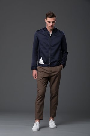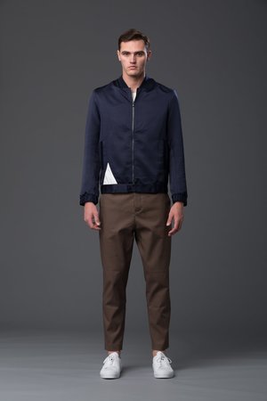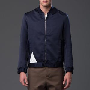 Now that bomber jackets are so ubiquitous, its all in the details for yours to truly stand out. Carlos Campos' Grosgrain Bomber, ties Carlos' modern design ethic with subtle deco references, to create a cool & unique bomber option. Worn with the Deveaux Carrot Slim Pants - 100% Polyester - Navy Grosgrain Polyester w/ White Contrast - Zipper Front, White Triangle Detail, Button Tab - Dry Clean only - Model measures: Height: 6'2", chest 40"/101cm, waist 31"/78cm, inseam 34"/86cm - Model wears a size 38 (medium) Made in the US (of course)