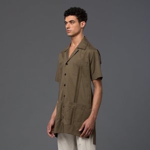 Carlos Campos reimagines the classic Havana nights shirt, the Guayabera, and creates a must have outerwear piece for Spring. The "Jackabera", as the designer loving calls it, transforms the traditional Wedding Shirt of Latin America countries and adds length to create the perfect layering piece for Spring. Campos goes for a clean aesthetic, using minimal pleating and matte black snaps to differentiate from the classic version. Cut in a crisp Tobacco Brown cotton poplin, this "jacket" is fitted for modern appeal, and will be a strong style piece for your collectsion. - 100% Cotton - Tobacco Brown Cotton Poplin - Snap Front Closure, Havana Collar, Front Pockets - Machine Wash Cold or Dry Clean, Do Not Bleach, Do Not Tumble Dry, Use Low Iron if Necessary - Made in the US (of course) - Fits true to size - Model wears a medium and measures: chest 38"/96cm, waist 30"/76cm, height 6'2"/188cm
