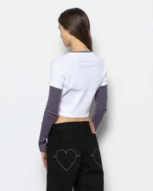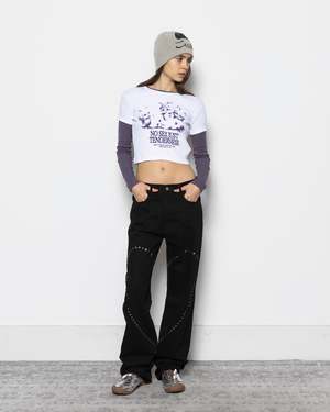 The Kitten Crush Tee by Carne Bollente is a cropped, layered long-sleeve t-shirt cut from a soft cotton jersey. This white shirt has purple details, including the sleeves and the ring around the crew neck collar. A large print of four kittens sits on the chest of this slim-fitting shirt. - 100% Cotton - Made in China - Machine wash cold, hang dry - Style code: AW25LT0501 Stella is 5'8" (173 cm) and is wearing a size S.