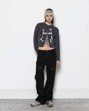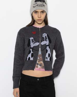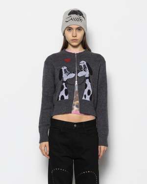 The Lady Meets Tramp Zipup Sweater by Carne Bollente is a slim-fit knit with a short, boxy frame, made from an acrylic, alpaca, and nylon blend. This hoodie features a large print of two dalmatians kissing, split down the middle by the zipper closure. It is designed with a two-way zipper and finished with ribbed cuffs and hem. - 40% Acrylic, 30% Alpaca Wool, 30% Nylon - Made in Portugal - Machine wash cold, hang dry - Style code: AW25CAR0101 Stella is 5'8" (173 cm) and is wearing a size S.