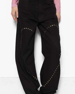 Carne Bollente Heart Break Pants in black. These straight-legged trousers feature star rivets forming a large heart-shaped detail, separated by the legs. They have a 5-pocket construction with back pockets designed with heart embroideries, belt loops with a branded vegan-leather patch on the back, and a zipper fly. - 100% cotton twill - Made in Portugal - Machine wash cold, hang dry - Style code: AW25DP0201 Stella is 5'8" (173 cm) and is wearing a size 28.
