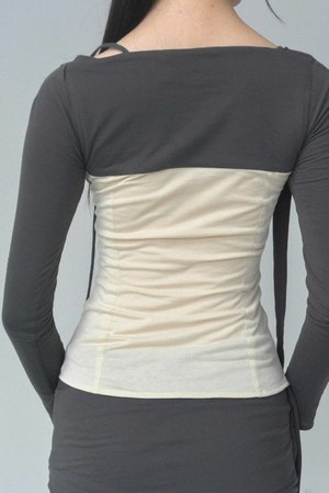 Bianco Long Sleeve Gray Top is a long sleeve top with hanging straps and drape details. Pull-over style. Scoop neckline. Stretchy double-layered cotton jersey for a body fitted cut. Colour: Dark Gray, Cream. Composition: 50% Cotton, 50% Rayon. Measurements: Length: 51cm for XS, S: 53cm for M.