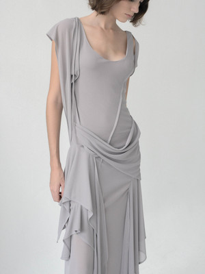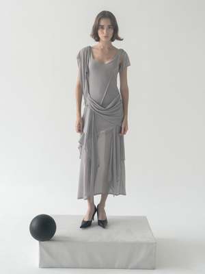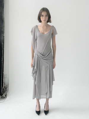 Draped slate-grey mesh dress with asymmetrical panels and fluid layered detailing. 100% cotton.