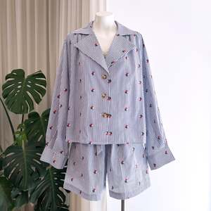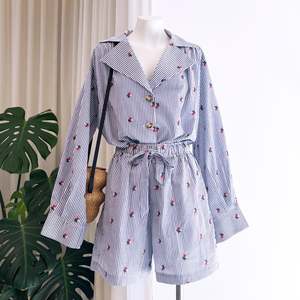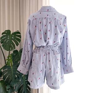 Caro Edition's Hannah Shorts are crafted from lightweight blue & white striped cotton fabric embroidered with small flowers and have an elastic waistband with a self tie fabric belt. The shorts are loose-fitted and feature back pockets and cargo details on the side. These trousers run large, we recommend going down one size from your usual one. 100% Cotton. Inseam length: 13 cm. Total length: 42,5 cm. Rise: 35 cm. Waist: 62 cm. Hips: 110 cm. (Measurements for size XS) Based in Copenhagen, Caro Editions is her founder's Caroline Bille Brahe most personal expression, characterized by quirky original prints and lively colors, creating playful and fun special clothes that you can wear every day.