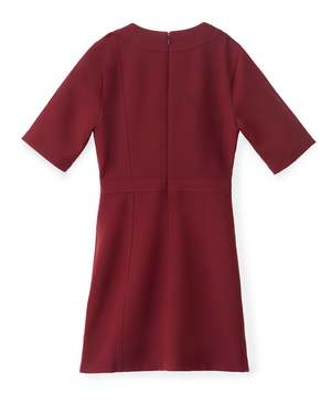 In a rich wine crepe, this spirited mini dress is perfect for festive nights that call for movement with elegance. - Crew neckline with trapunto stitch detail - Tailored bodice with fixed waistband and elbow-length sleeves - Faux horn button accents with invisible back zipper Fabric: 63% Polyester, 27% Viscose, 7% Cotton, 3% Elastane Care: Dry Clean Only Garment Length: Size S is 35".