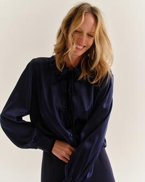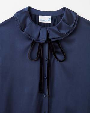 Perfect for evenings that call for a chic touch, this midnight silk blouse is finished with velvet ribbon and cascading ruffles to bring timeless femininity to candlelit dinners and holiday gatherings alike. - Silk charmeuse satin with self-covered buttons - Double ruffle collar with velvet ribbon accents - Gathered long sleeves with shirred cuffs Fabric: 92% Silk, 8% Spandex Care: Dry Clean Only Garment Length: Size S is 24 3/4"