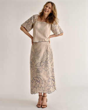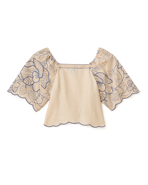 Crafted in natural cotton linen, the Bryn top features a waterfall-embroidered half sleeve and an embroidered scalloped hem. - Floral embroidered details - Square neck detail - Elasticized sleeves Garment length: size S is 15".