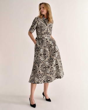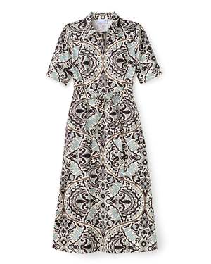 Coastal town charm echoes through the Cara dressclassic, relaxed, and endlessly wearable, with engineered print and tailored lines balancing structure and ease. Button-front collared shirtdress silhouette offers versatile styling. The self sash belt allows adjustable waist definition. On-seam pockets and cotton sateen fabric combine comfort and structure. Fabric: 97% cotton, 3% spandex (cotton sateen). Care: Dry clean only. Garment length: Size S is 49 1/2".