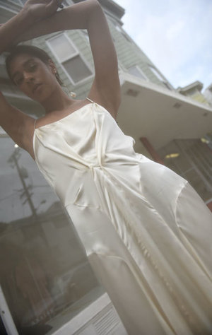 Vintage-inspired slip dress with gathered detailing in fluid, lustrous cream-hued viscose. Thin, non-adjustable spaghetti straps. Slant pockets at hips. Fastens with cream hued buttons and features a zip closure at left side. Made in Bulgaria. Color: Cream Composition: 100% Viscose Fit Info: Runs true to size. Hannah is 5'11", size 2, and wears the Carven Slip Dress in French size 34, which is equivalent to US size 2. Measurements: FR 34/US 2 Bust 30"/Waist 26"/Hips 38"/Length 49" FR 36/US 4 Bust 32"/Waist 28"/Hips 40"/Length 50" FR 38/US 6 Bust 34"/Waist 30"/Hips 42"/Length 51" FR 40/US 8 Bust 36"/Waist 32"/Hips 44"/Length 51.5" FR 42/US 10 Bust 39"/Waist 36"/Hips 46"/Length 52"