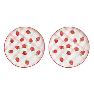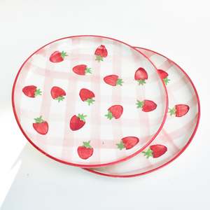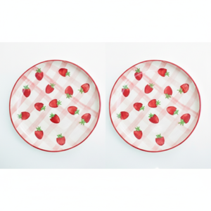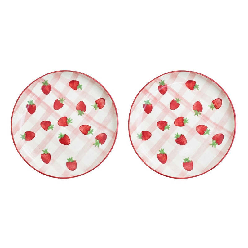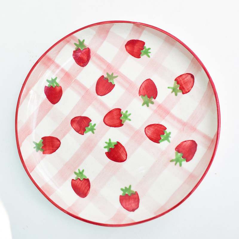 Handmade ceramic dessert plate with hand-painted strawberry motifs atop a checkered design. Perfect for serving treats. Material: Ceramic Size: 7 Inches Care: Avoid using abrasive materials to wash. Clean gently and wipe with a soft dry cloth. Avoid sudden temperature changes. Avoid long-term direct exposure to sunlight.