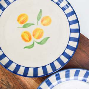 These ceramic dessert plates feature a hand-painted apricot motif within a blue striped border, offering a distinct Mediterranean aesthetic. The 7-inch diameter is suitable for serving small courses or desserts. Each plate is crafted from durable ceramic, ensuring longevity with proper care. The set of two provides a charming addition to any table setting, whether for everyday use or special occasions. FEATURE BULLETS: Set includes two 7-inch ceramic dessert plates. Hand-painted apricot design with a blue striped rim. Durable ceramic construction for everyday use. Hand wash recommended; avoid abrasive cleaners.