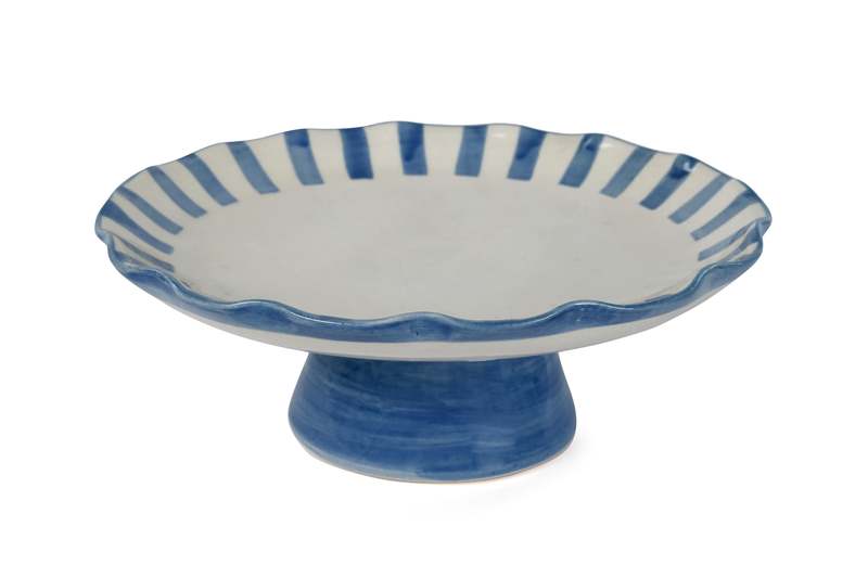 This cake stand is a decorative and functional piece for serving baked goods. Crafted from durable ceramic stoneware, this stand features a hand-painted blue stripe design around the rim and a solid blue base. Its raised surface offers a stable platform for cakes, pies, or other desserts, making it suitable for everyday use or special occasions. The stand is produced in India, reflecting artisanal craftsmanship. FEATURE BULLETS: Constructed from durable ceramic stoneware for lasting use. Dimensions: 10 x 10 x 3.75 inches, providing ample display space. Hand-finished in India, offering a unique artisanal touch. Food safe, microwave and dishwasher safe for convenient serving and cleaning.