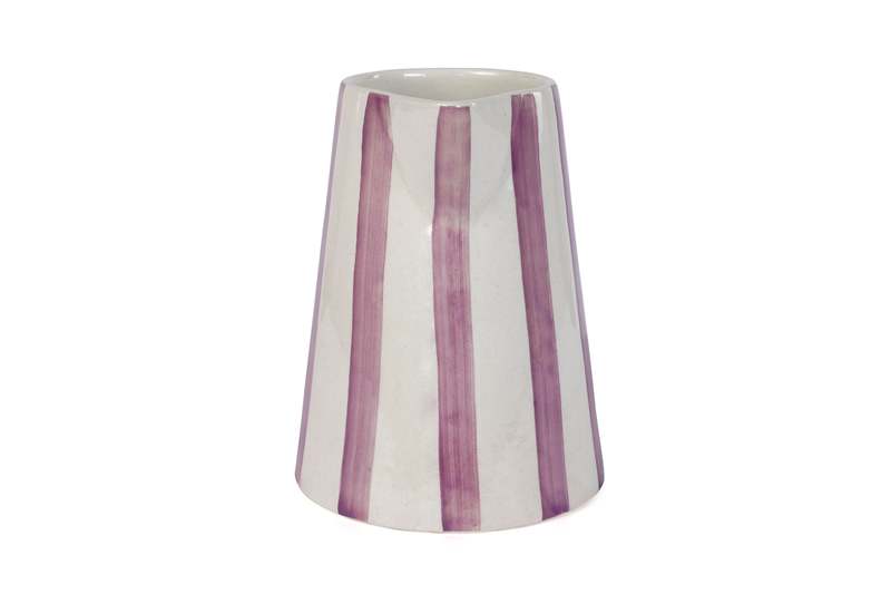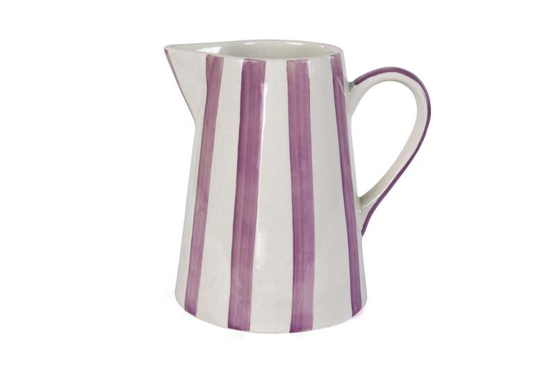 This ceramic pitcher features a hand-painted stripe pattern in purple. Its generous capacity makes it suitable for serving beverages or as a decorative vase. Each piece is individually crafted, offering a unique addition to your home. FEATURE BULLETS: Crafted from hand-painted stoneware ceramic for durability. Dimensions: 8.25 inches wide x 8.25 inches deep x 8 inches high. Holds 180 ml, ideal for single servings or small batches. Microwave and dishwasher safe for convenient use and cleaning.