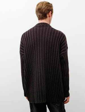 An oversized crew neck sweater knit with a decorative open rib motif using a high gauge merino wool yarn in a deep shade of coffee brown. Cut with a generous body and Casey Caseys signature high armhole this bulky top layer complements their shirting well and layers nicely. Finished with a chunky double layered rib knit at the neckline, ribbed cuffs and a flat hem that drapes elegantly away from the body. Constructed using knit linked seams for a more long lasting shape that is highly resistant to wear. - Made in Italy - 100% merino wool - Oversized; high armhole and tapered sleeve - Hand wash only - WILLIAM IS 6'1", 145LBS AND WEARS SIZE MEDIUM