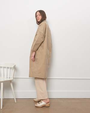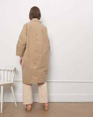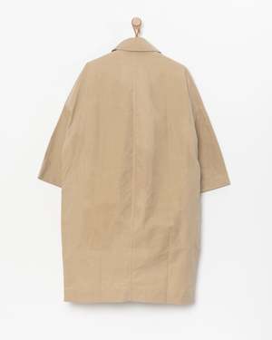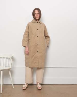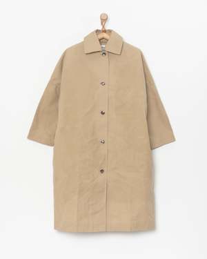 The perfect seasonless forever coat, honoring the classic macintosh style, made from heirloom quality weatherproof British dry wax cotton in a warm taupe. Features an oversized, mid-length cocoon silhouette, perfect for layering over sweaters or light Summer layers, with horn buttons down the front, vertical seams down the back, an oversized and pointed collar for extra protection flipped up, side seam pockets, and a loop for hanging. Natural variations and imperfections will occur due to the nature of the 100% waterproof waxed cotton fabric, which ages beautifully over time to create even more uniqueness. Simply brush droplets off, or hand wash or wipe to clean more thoroughly. Made in London.
