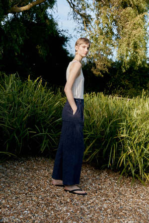 The timeless Georgia trouser is crafted from a Japanese cotton/linen dyed jacquard, offering a textured and uniquely coloured fabric. It features a straight leg cut with a sailor-style side button fastening, side seam pockets, back patch pockets, and belt loops at the waist. Made in London. Material Japanese cotton/linen dyed jacquard: 82% cotton, 18% linen. Shell buttons. Care Instructions Dry clean only. Dimensions The Georgia trouser fits true to size. Namara is 5'10" and wears a size XS.
