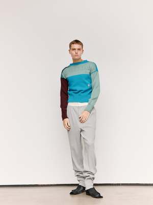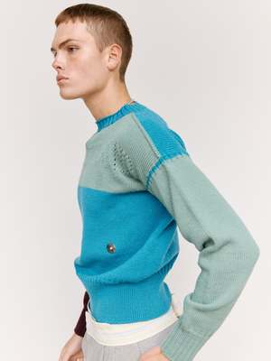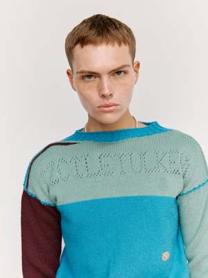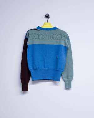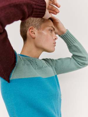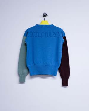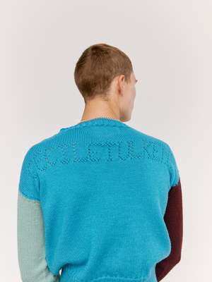 Tight knit Gansey with traditional armpit and neck gussets. Pointelle logo2 front and back. Thick 1x1 rib at hem, 2x2 at neck and cuffs. Square boxy fit with generous arm length. Knitted on Japanese 3D knit technology (no seams) bringing the original circularly hand-knitted sailors garments back to life in the most historically accurate manner, on state of the art modern machinery. This new colourway, using a different colour in each feeder reveals how the garment is constructed inside the machine. British wool
