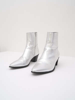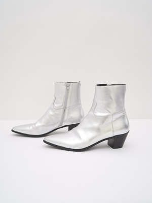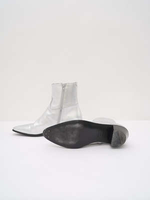 Metallic silver leather "JACNO" Chelsea boots from Celine. Features a stacked block heel, a pointed toe, and western-inspired stitching detail in front. Finished with a side zip closure and includes original dust bag. Material: Leather Rating: 9 / 10 - Almost no visible signs of wear. MEASUREMENTS Heel Height: 2.5 in Footbed Length: 11.25 in