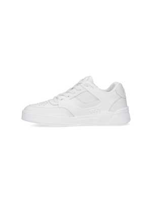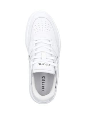 Celine 'CT-09' low-top sneakers in white leather with round toe, lace-up closure, logo2 patch on tongue, side mesh inserts, embossed logo2 detail, tone-on-tone embossed logo2 on the back tab, textured rubber sole, and embossed logo2 detail on the back. Composition: 95% Calf Leather, 5% Mesh.