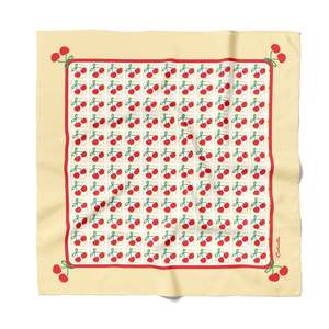 Add a pop of playful charm to your everyday style with this Cherry Cotton Silk Bandana. Enjoy the soft, smooth feel of the cotton-silk blend against your skin as you tie it as a chic headband to keep hair off your face or as a stylish neckerchief to elevate a simple T-shirt. This versatile accessory is designed to add a touch of personality to any outfit. The delightful cherry print, hand-illustrated in California, is a one-of-a-kind design that reflects a love for nature and brings a fresh, vibrant feel to your look. Its generous size makes it perfect for multiple styling possibilities, from a classic head wrap to a fashionable bag accent. PRODUCT FEATURES: - Cotton and silk twill blend offers a smooth, comfortable feel. - Versatile design can be worn as a headband, neckerchief, or hair accessory. - Unique cherry print, hand-illustrated in California, adds a distinctive touch. - Machine-stitched hem ensures a clean, durable finish. PRODUCT SPECIFICATIONS: - Material: 30% Silk / 70% Cotton Twill - Dimensions: 23" x 23" / 60 cm x 60 cm - Hemming: Machine hemming - Print: One side printed - Artist: Illustrated by hand in California by Cris Rose-Guizar - Sourcing: Ethically sourced - Weight: 1.6 oz