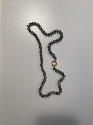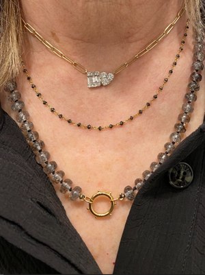 18 Black Rutilated Quartz hand knotted gemstone necklace with 14K gold sailor clasp. Wear alone or mix with your favorite neck stack. Stones measure 8mm.