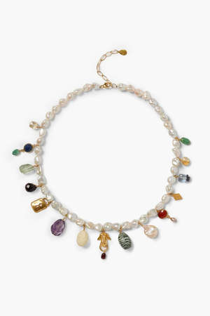 The Eve Charm Necklace is a wearable trove of treasures. Suspended on a string of pearls are a rainbow of gems, charms, and pearls that capture your every movement. Adjust the gold closure for your ideal fit. DESIGNER ID: NG-15469LQ-MULTI COMPOSITION: 18K gold plated sterling silver, white freshwater pearl, taupe rice pearl, blue sapphire, green aventurine, green and purple amethyst, red tigers eye, silver eye jasper, carnelian, iolite, citrine, garnet. DETAILS: 17-19 adjustable Handmade in Vietnam.