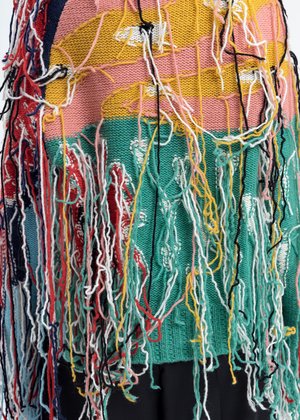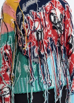 Multicolour patchwork reconstructed sweater with loose fringe tassel detailing. Features a panelled construction. Multicoloured tassel strings throughout. Finished with a rib knit crew neck collar, cuffs and hem. Regular Fit 80% Lambswool, 20% Nylon Imported Model is wearing a size M
