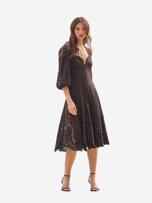 Charo Ruiz's Corbin midi dress is a statement of romantic elegance with character. Its scalloped sweetheart neckline and defined cups gently enhance the bust, while the long puffed sleeves add volume and balance to the design. Crafted with artisanal embroidery, the subtly flared midi skirt and scalloped hem create a soft, feminine silhouette. This piece is designed to stand out with delicate grace on special occasions. Product Details Designer ID: 263615 Color: Black Composition: 70% Cotton, 30% Polyester Imported.