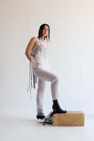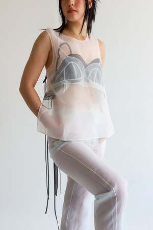 This top has two layers of sheer organza encasing two sheer bras. Open back adds a contemporary touch, while allowing you freedom to experiment with various styling options. Handmade in New York. This top is one size. Material 100% Polyester