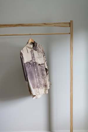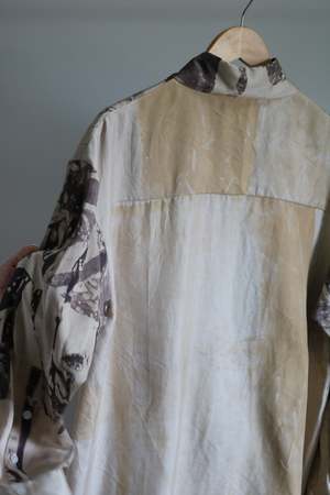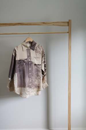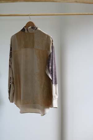 Hand-screen printed silk shirt, entirely dyed with natural shell nut dye, making each piece truly one of a kind. Hand-dyed in Provence, France, this unique garment is a creation of our studio. The buttons are handmade in Italy from mother-of-pearl, and the shirt is expertly hand-sewn in New York.
