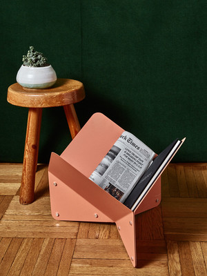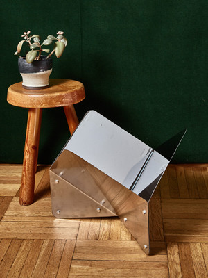 Three identical stainless steel petals come together to form a large floor-standing container for books, magazines, etc. Available in blue, peach, grey (not pictured), and mirrored-polished stainless steel. --NOTES-- Jamie Wolfond of Good Thing and Chen and Kai collaborated to make a more accessible version of the marble Third Eye Vessel and we love what they've come up with!