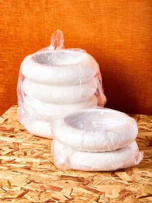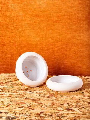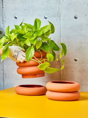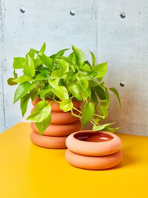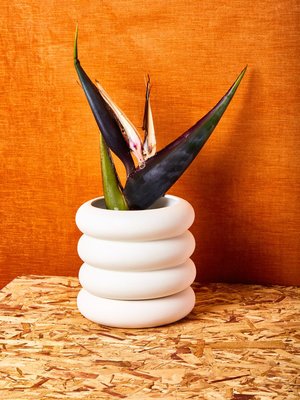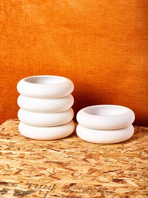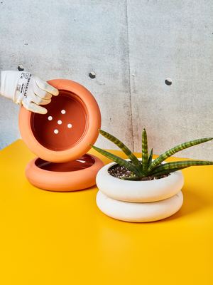 Porcelain, glazed interior, unglazed exterior. The bottom ring is the saucer. This design integrates both the planter and the saucer into one form holistically. Short: 8" DIA x 4" H Tall: 8" DIA x 8" H --NOTES-- Chen and Kai are dear friends. Their designs have always spoken to us in their originality and ingenuity. The shapes of these planters are inspired by the beautiful designs of high voltage ceramic insulators found on power lines.