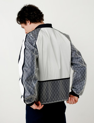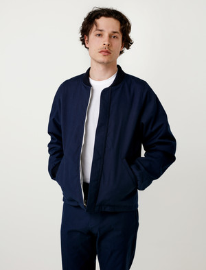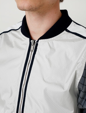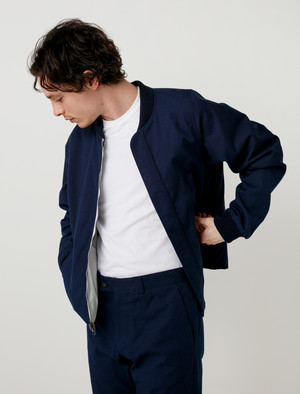 Sailing aesthetic ideas and highly technical materials were fused to create the reversible Spray bomber for SS17. Developed in the USA, designer Robert Childs, the jacket is made with a mix of waterproof materials on one side, and a heavy workwear canvas outside. Details of the bomber include rounded dolman sleeve construction, functional two way zipper, double slash pockets on both sides and a straight bottom hem. Also features navy ribbings at collar and cuffs. - Made in USA - Made of nylon and cotton canvas - Regular fit - Dry clean - Model is 5'9", 140 lbs and wears size small - Product Measurements SIZE Pit to Pit Shoulders Pit to Cuff Back Length S 22'' 19'' 20.5'' 24.5'' M 23'' 19'' 22'' 25.5'' L N/A N/A N/A N/A