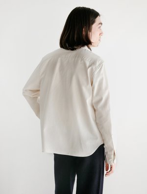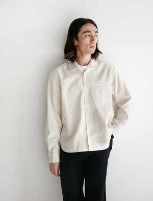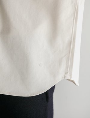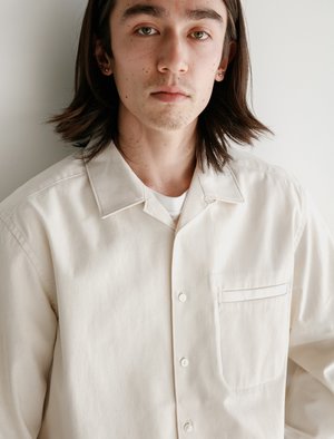 This shirt is made from a natural cotton with small flecks of a darker tone throughout. The cut is versatile enough to be worn in colder weather with layering pieces or as a standalone piece in the warmer months. It features an open collar, curved hem, mother of pearl buttons and a minimal chest pocket. - Made in Japan - 100% Cotton - Boxy fit - Cold wash. Line dry - Ren is 5'10", 145 lbs. and wears size medium
