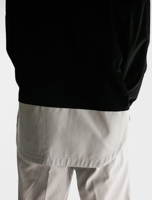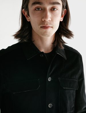This overshirt comes in a soft corduroy with a contrasting canvas panel at the base. It features two geometric chest pockets with clasp buttons mirroring those on each cuff. The woven CHILDS logo2 is subtly placed just above the curved hem. - Made in Japan - 100% Cotton - Boxy fit - Dry clean - Ren is 5'10", 145 lbs and wears size small