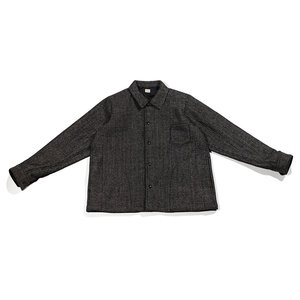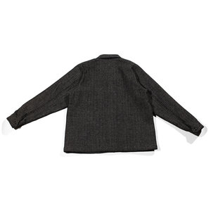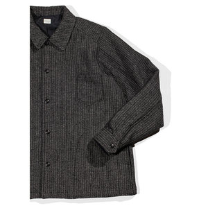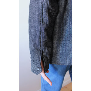 the Chimala Jacquard Shirt Jacket is a coach style jacket in richly textured, heavyweight jacquard metal snap buttons at front and cuffs pointed collar side seam pockets relaxed, unisex cut fully lined shell: 72% cotton 19% acrylic 9% polyester / lining 100% polyester dry clean only made in Japan XS: bust: 22" sleeve: 23.5" length: 26.5" S: bust: 23" sleeve: 24" length: 27" M: bust: 24" sleeve: 24.5" length: 28.5" seen here on the body with the Raquel Allegra New Boyfriend Tee in Slate & the Chimala 13oz Width Denim 70s Straight in Used Rinse