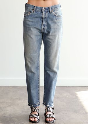 Chimala's Narrow Tapered Cut in a Vintage Medium with distressed ankle detail. As always, all distressing is done by hand and the fit is narrow in the leg with a medium rise and raw hem. The perfect, softest distressed denim.. The classic Chimala style that we all live in. - 5 pocket, button fly, selvedge cut - Hand wash, hang dry - 100% premium Japanese cotton - Made in Japan Worn with Lauren Manoogian Long Sleeve U Tee in grey melange and Mari Giudicelli Tapir sandal. Kyrie is 5'10" and is wearing a size 26.