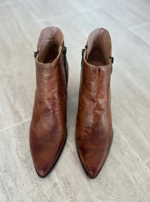 Step into something special with the Eri block heel bootie! This fashionable kick offers all day comfort, so you can feel chic and cozy at the same time. Plus, it goes perfectly with all your favorite denim, and is a beautiful shade of brown. DESIGNER ID: ERI COLOR: BROWN COMPOSITION: LEATHER UPPER/LINING + SYNTHETIC SOLE FIT: RUNS TRUE TO SIZE - Leather Uppers - Dual side zip entry - Leather Lining - Cushioned footbed - 3" Block heel Imported